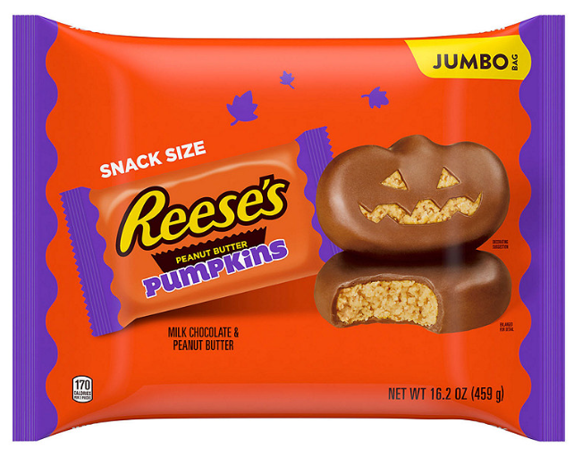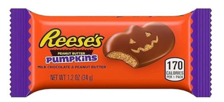 Hershey sells Reese's Milk Chocolate Peanut Butter Pumpkins. Pictured on the packaging is a photo of a chocolate pumpkin decorated with a jack-o'-lantern face and filled with (presumably) the familiar Reese's Peanut Butter Cup filling. The packaging looks like this: